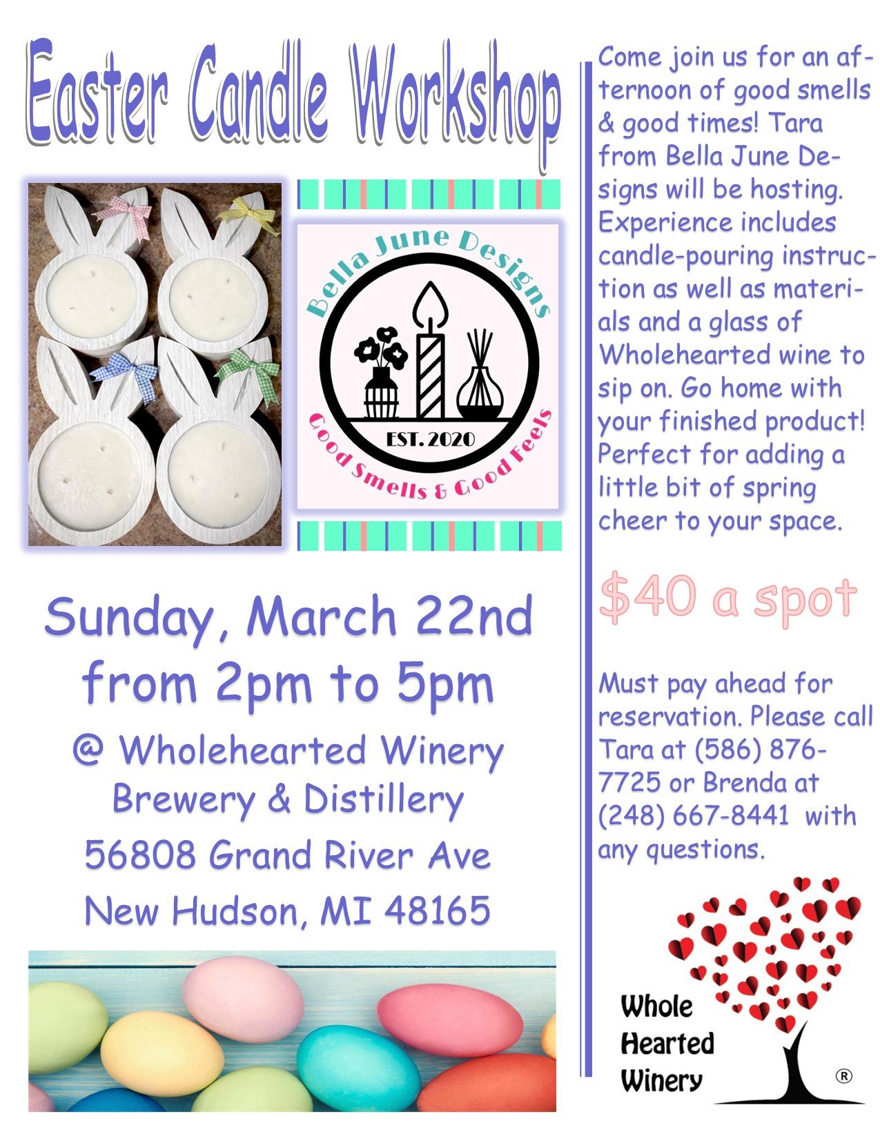 Easter Candle Making Class – Hosted by Bella June Design March 22 @ 2:00 PM - 5:00 PM Whole Hearted Winery, Brewery & Distillery 56808 Grand River Ave. Ste 5, New Hudson, Michigan, United States Upstairs at Whole Hearted Winery. $40